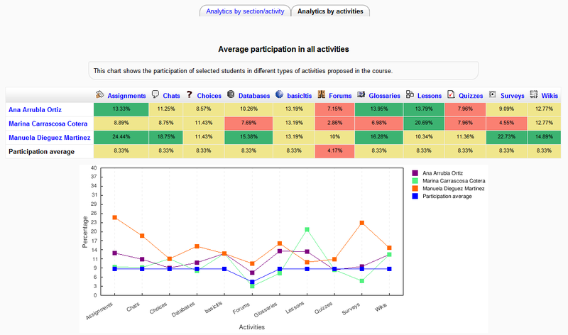 GISMO is a visualisation tool that uses log data to produce a graphical representation of students’ interactions. It allows teachers to analyse the learning activities (attendance to courses, reading of materials, submission of assignments, etc.) of the students in all the courses proposed on the platform. The tool allows teachers to have an overview of the performance of an entire class, and not on a single student or a particular resource.