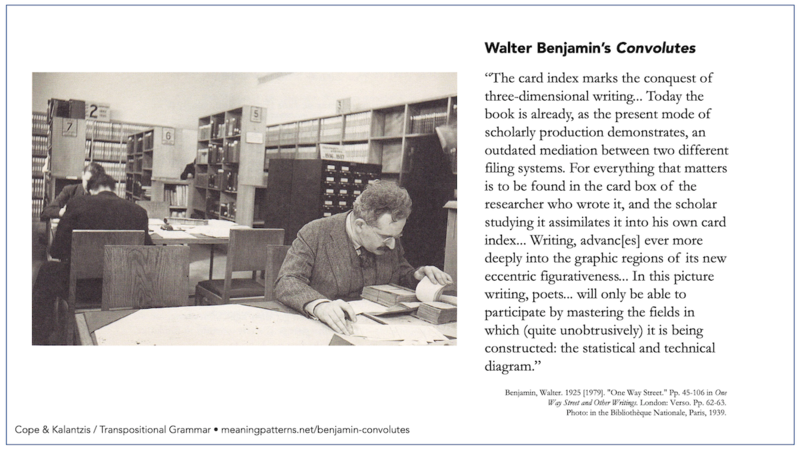 The card index marks the conquest of three-dimensional writing … Today the book is already, as the present mode of scholarly production demonstrates, an outdated mediation between two different filing systems. For everything that matters is to be found in the card box of the researcher who wrote it, and the scholar studying it assimilates it into his own card index … Writing, advanc[es] ever more deeply into the graphic regions of its new eccentric figurativeness … In this picture writing, poets … will only be able to participate by mastering the fields in which (quite unobtrusively) it is being constructed: the statistical and technical diagram.22