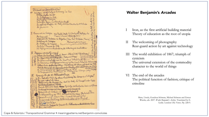 And, as much as we are committed to theoretical work in the spirit of Benjamin, we’re also constrained by the affordance of text (as was he, in the works he finished), where one word unforgivingly follows another. But the interconnections run every which way, like a card index – or a database. Benjamin’s convolutes presciently foretell the database, where today we have machines to help us to assemble sense from scraps of information.