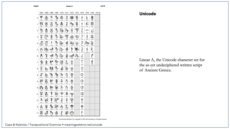 Unicode is a comprehensive character set documenting all systems of written text.31 Of the 136,755 characters in Unicode version 10, a few are: a, A, 7, ?, @, 威, ي and ☺. For writing that is principally alphabetic, graphemes mostly represent sounds. In other scripts characters mainly represent ideas, such as in Chinese where each character is an ideograph – although the distinction is not so clear, because for writers in mainly alphabetic languages 7, @ and ☺ are ideographs, and utterable sounds can be represented in Chinese. Unicode includes symbolic scripts that range from Japanese dentistry symbols to the recycle symbol, and 2,623 emojis.§AS1.1.1a It also includes obscure historical scripts, like Linear A, an as-yet undeciphered written script of Ancient Greece.