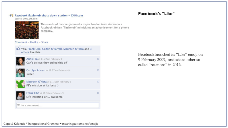 One hundred and seventy-six emojis designed by Shigetaka Kurita were made available on mobile phones by the Japanese telephone company NTT in 1999. For this history-making contribution to human practices of visualization, in 2016 they were acquired for the collection of the Museum of Modern Art in New York. In its announcement, the museum called them “humble masterpieces of design [that] planted the seeds for the explosive growth of a new visual language.”41 Emojis were added to Microsoft Windows in 2008, the Apple OS in 2011, Google Android in 2013. Facebook launched its “Like” emoji on 9 February 2009,42 and added other so-called “reactions” in 2016.43