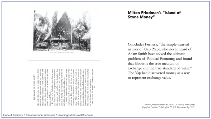 The meaning of the thing we call “money” was not just in the fei stones on Yap. Nor is it in our modern experience of markets (just) in the pieces of paper that are banknotes, or the plastic of credit cards, or an invoice or receipt, or the information we can today pull up on screens about our account transactions or balances – some of the multimodal media and transpositional practices by which we mean “money” today.