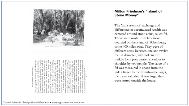 - Kalantzis, Mary and Bill Cope, 2020, Adding Sense: Context and Interest in a Grammar of Multimodal Meaning, Cambridge UK: Cambridge University Press, pp. 274-84. [§ markers are cross-references to other sections in this book and the companion volume (MS); footnotes are in this book.]