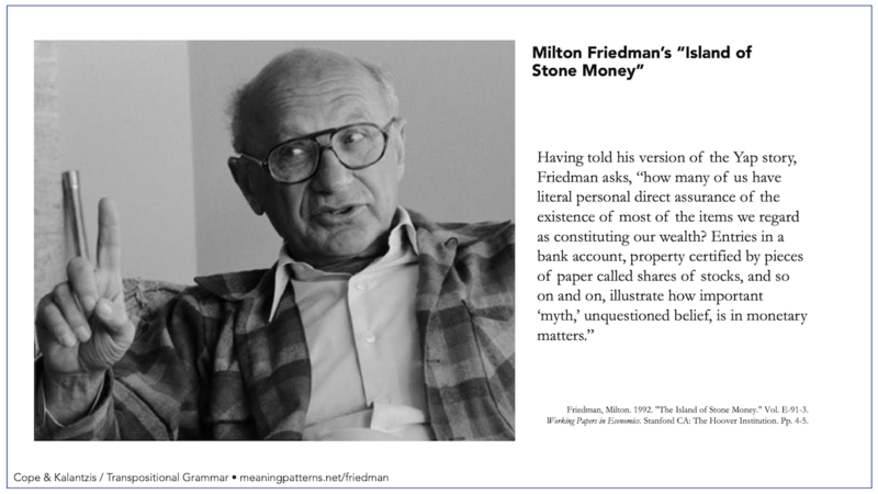 Having told his version of the Yap story, Friedman asks, “how many of us have literal personal direct assurance of the existence of most of the items we regard as constituting our wealth? Entries in a bank account, property certified by pieces of paper called shares of stocks, and so on and on, illustrate how important ‘myth,’ unquestioned belief, is in monetary matters.”276