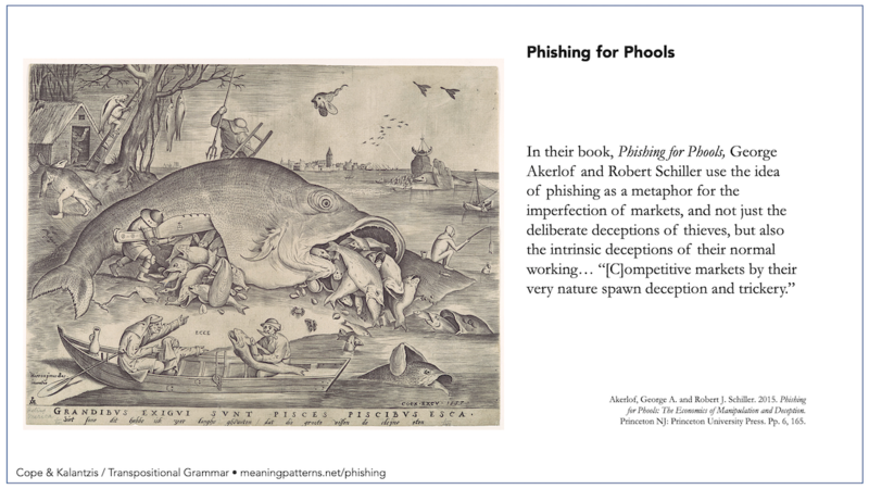 In their book, Phishing for Phools, George Akerlof and Robert Schiller use the idea of phishing as a metaphor for the imperfection of markets – not just the deliberate deceptions of thieves, but also the intrinsic deceptions of their normal working.287